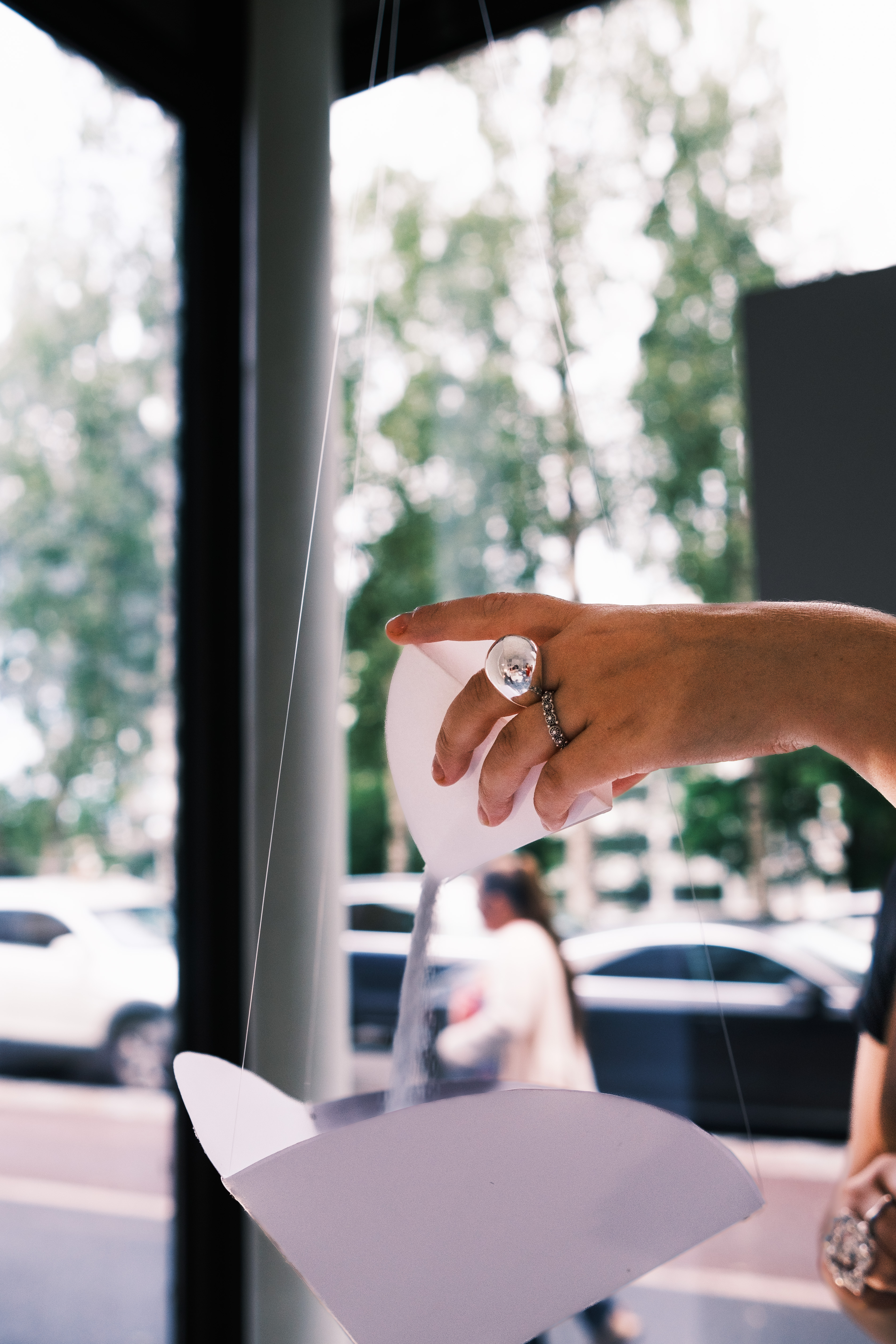 Nearly 30 paper bowls, resembling hourglasses, dangle from the ceiling, releasing a delicate stream of salt to accumulate on the floor below. This imagery symbolizes fragility and the fleeting nature of time. A wooden coffin with a tactile, raw exterior sits nearby, filled with plaster- molded leaves and twigs, reminiscent of bone fragments left after cremation. Commissioned by Platform Residency, in Vaasa, Finland.
